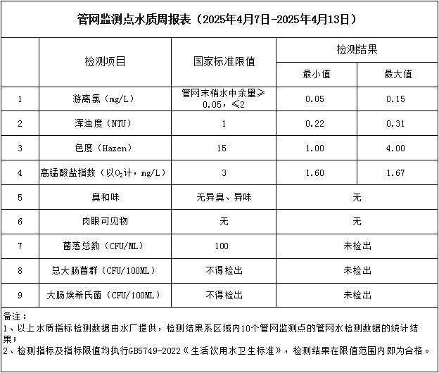 管網監測點水質周報表(2025年4月7日-2025年4月13日)