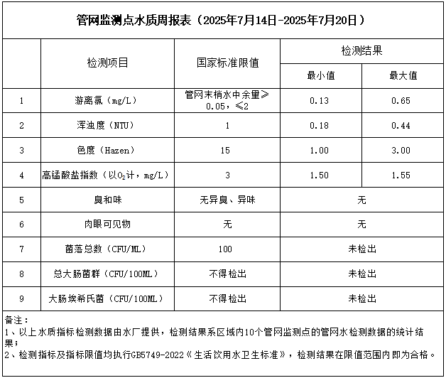 管網(wǎng)監(jiān)測點(diǎn)水質(zhì)周報表(2025年7月14日-2025年7月20日)