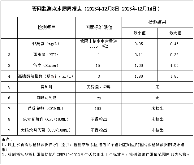 管網監測點水質周報表(2025年12月8日-2025年12月14日)