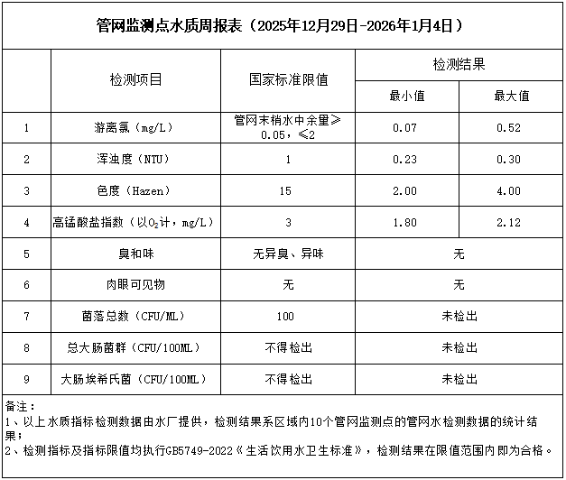 管網監測點水質周報表(2025年12月29日-2026年1月4日)
