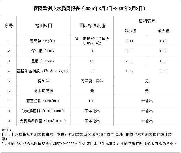 管網監測點水質周報表(2026年3月2日-2026年3月8日)