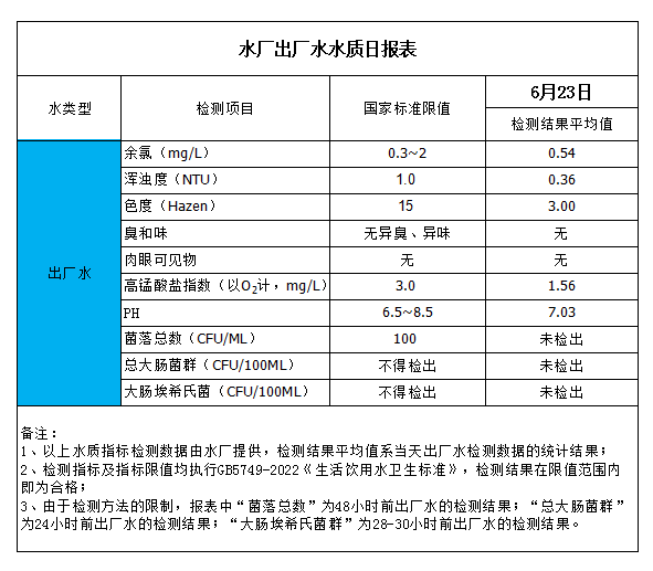 水廠出廠水水質日報表(2023-6-23)
