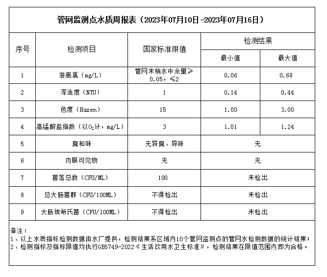 管網監測點水質周報表(2023年07月10日-2023年07月16日)