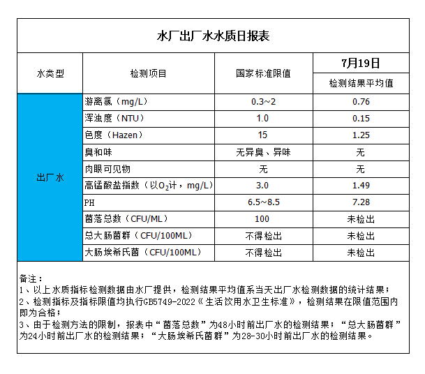 水廠出廠水水質日報表(2023-7-19)