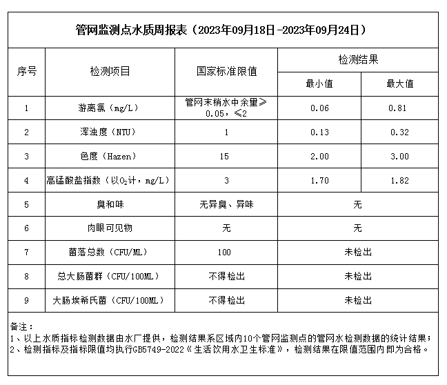 管網監測點水質周報表(2023年09月18日-2023年09月24日)