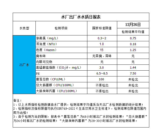 水廠出廠水水質(zhì)日?qǐng)?bào)表(2023-12-26)