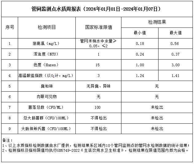 管網監測點水質周報表(2024年01月01日-2024年01月07日)