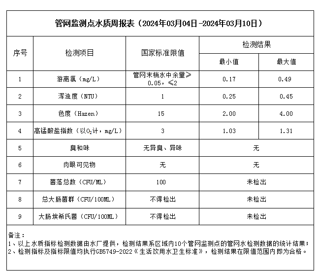 管網監測點水質周報表(2024年03月04日-2024年03月10日)